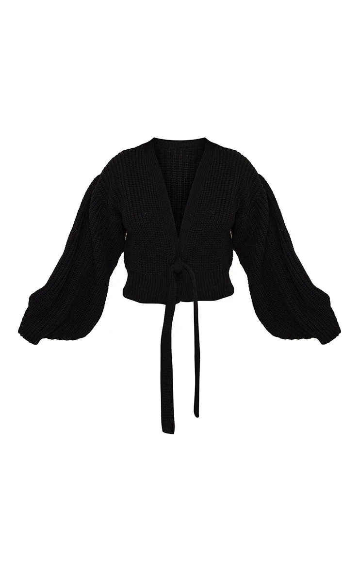 Complete your A/W look with this cardigan doll. Featuring a black chunky knit material with tie waist detailing and balloon sleeves. Team with a knitted sweater, faux leather bottoms and chunky combat boots to complete the look.
