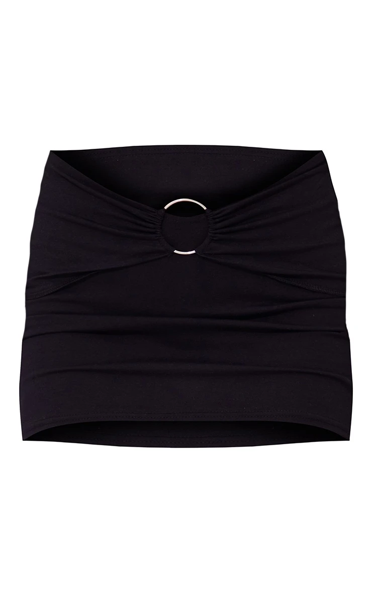 Get ready to have all eyes on you in this skirt. Featuring a black jersey material with a ring front design and a micro mini length. Style with a cropped tee and knee high heeled boots for a look that is bringing all the drama.