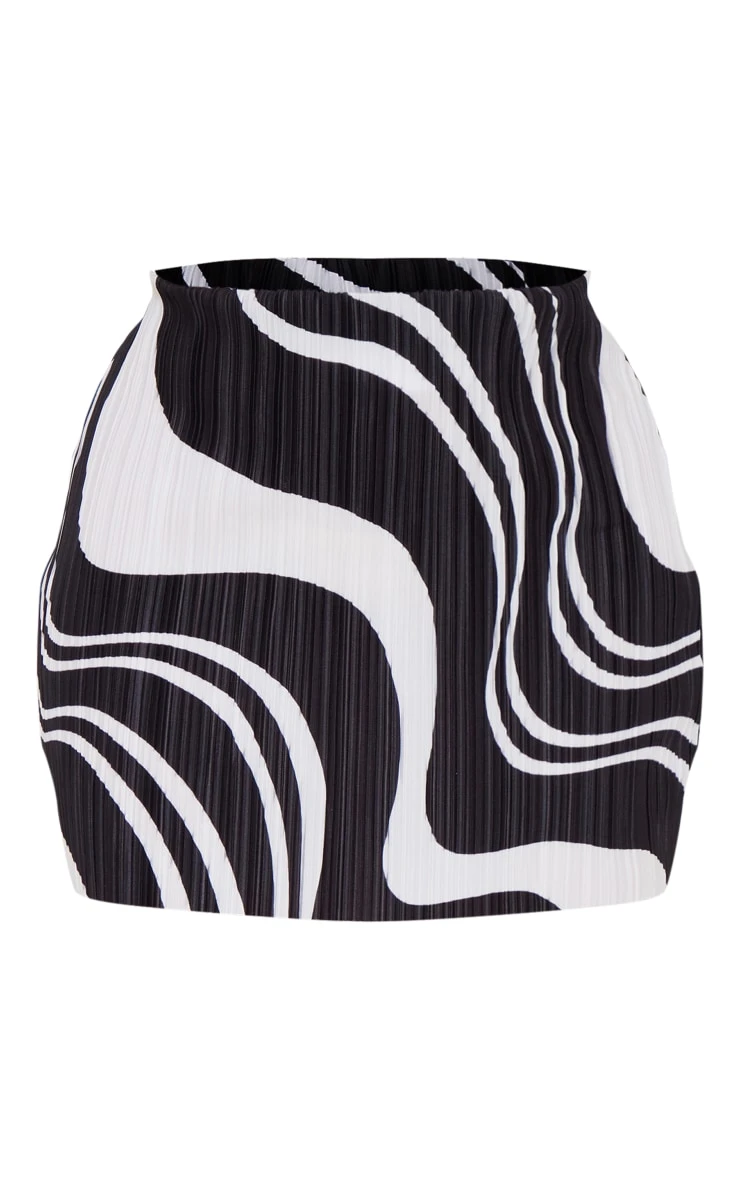 This mini skirt is perfect for those weekend plans. Featuring a black printed plisse material in a mini length and a flattering fit, what’s not to love? Style this with a corset, tie-up heels and a blazer to complete the look.