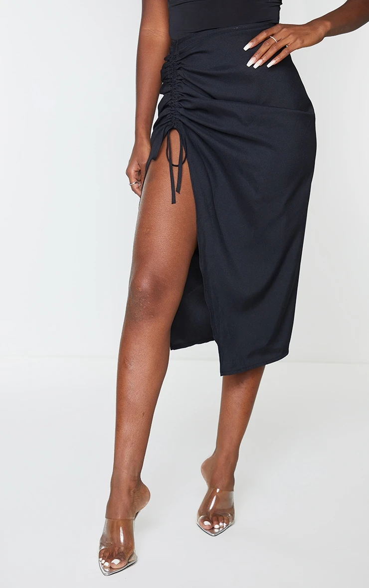 This skirt is a must-have staple piece for your wardrobe. Featuring a black woven material with ruched detail and a midi length, what’s not to love? Team this with a bodysuit and heels for a weekend-worthy look.