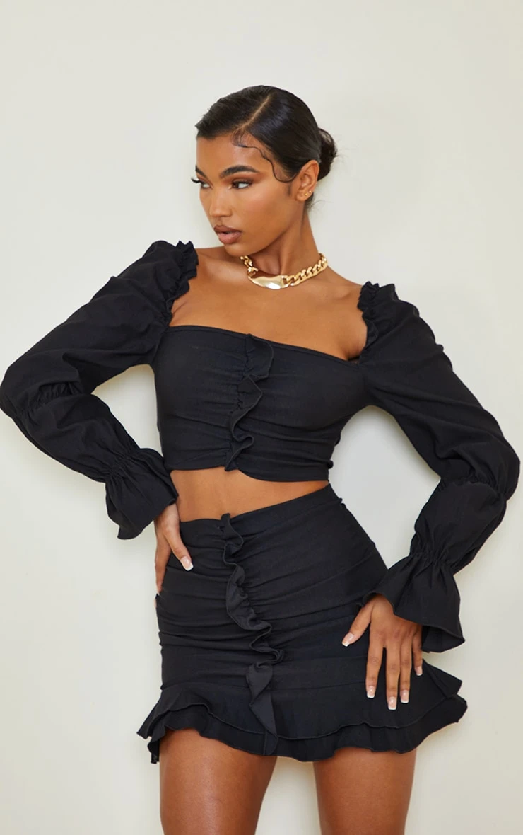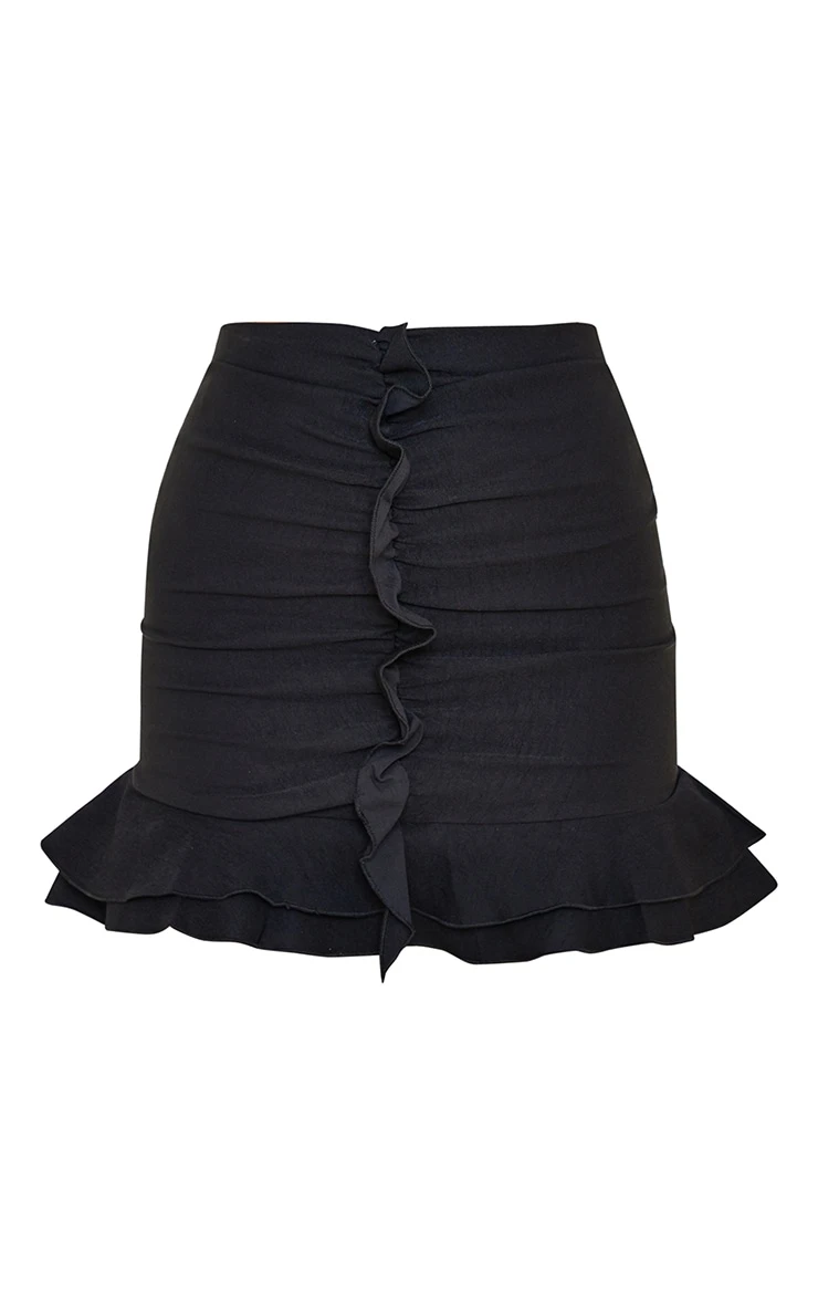 This skirt is perfect for those last-minute occasions. Featuring a black stretch woven fabric with frill design and ruched detailing, team this with the matching top and heels for an all-black look we’re loving.