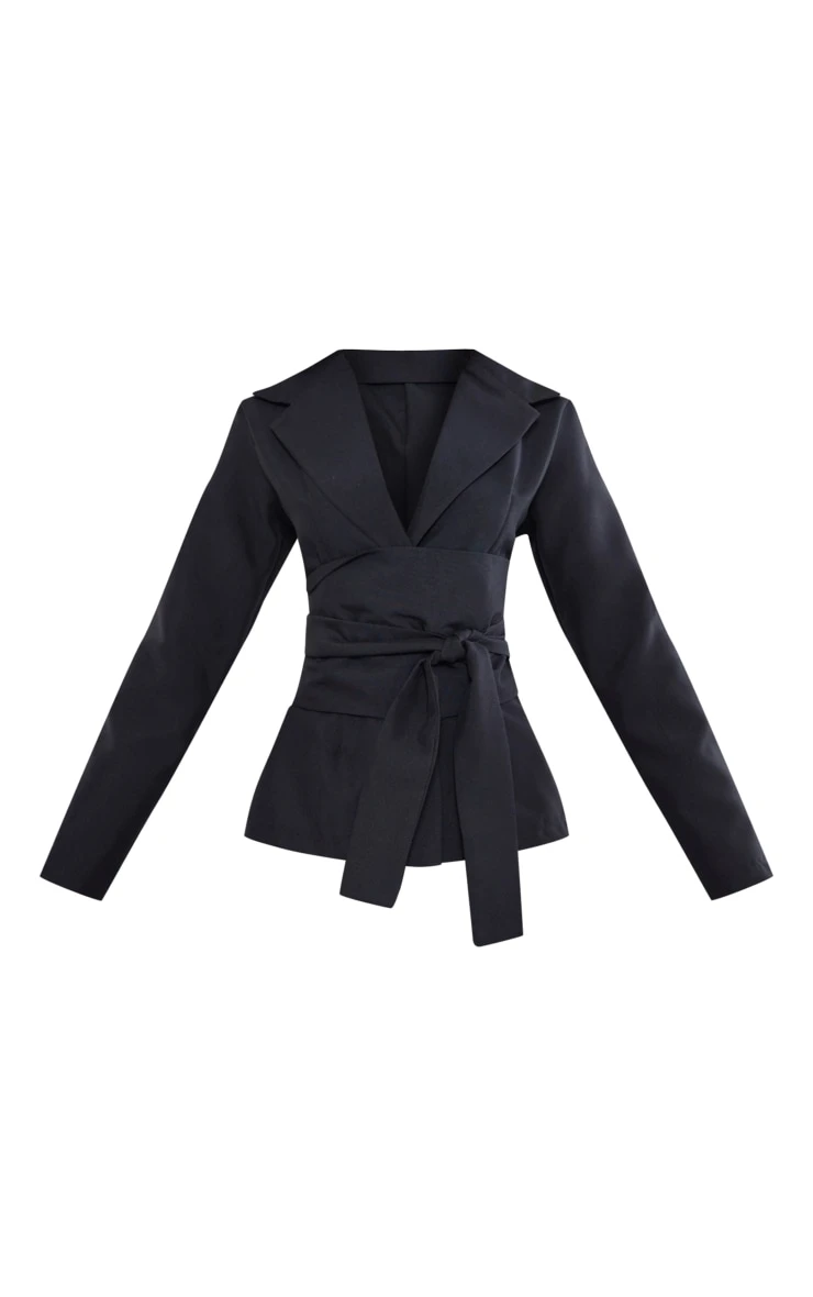 Update your weekend wardrobe with this dreamy blazer. Featuring a black woven material with a belt tie waist design, how could you say no? Wear with the matching shorts, black high heels and gold accessories to complete the look.
