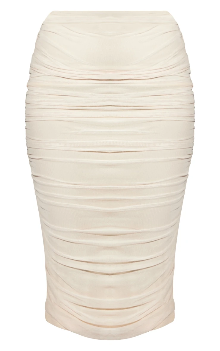 Get ready for your date night with this dreamy skirt. Featuring a champagne mesh material with ruched detailing and a midi length, we’re in love. Wear with the matching top, high hels and silver accessories for a statement finish.