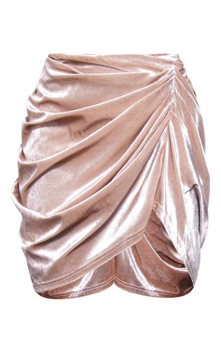 Inject some glam vibes into your weekend look with this mini skirt doll. Featuring a champagne velvet material with ruched detailing and a draped design. Pair with the matching top and dreamy heels for a full chic look.
