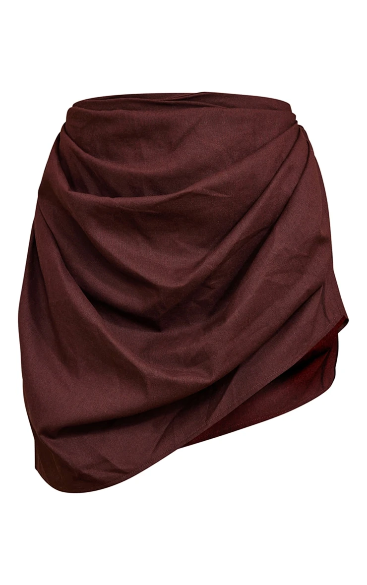 Mini-skirts are so on-trend this season and this chocolate brown gathered mini-skirt is at the top of our hit list. Its chocolate brown hue material gives you that clean-girl aesthetic and with a gathered draped design it adds a touch of glam to your vibe. This mini skirt has a high waist and a figure-flattering fit that will turn heads for all the right reasons. Style with a corset top, a shoulder bag, and clear heels for an unreal look.