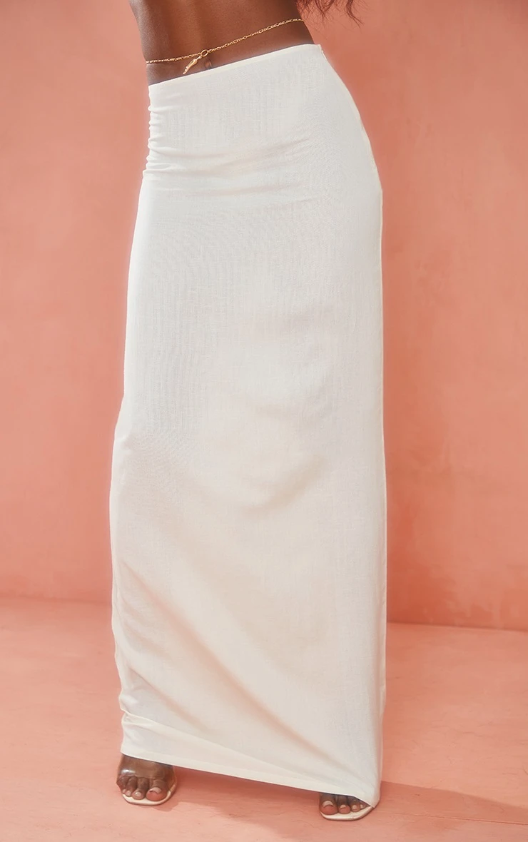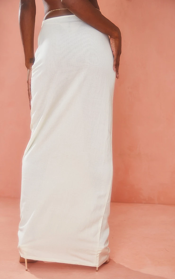 Look all kinds of glam in this maxi skirt doll. Featuring a cream brushed woven material with a ruched V front design and a maxi length, we’re obsessed. Style with the matching top, a white clutch bag and mules for a glam finish.