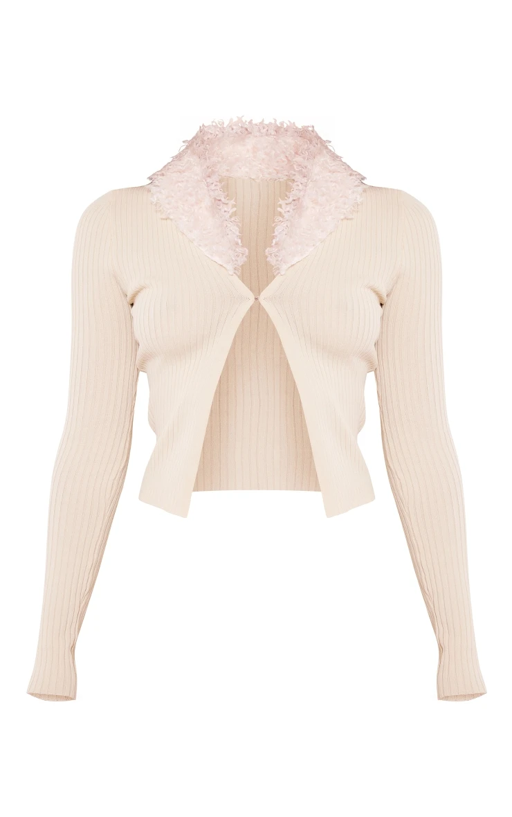 Add a touch of glam to your new season wardrobe with this cardigan. Featuring a cream ribbed knitted material with a faux fur collar and long sleeves. Pair with the matching skirt and heeled boots for a chic, Insta-ready fit.