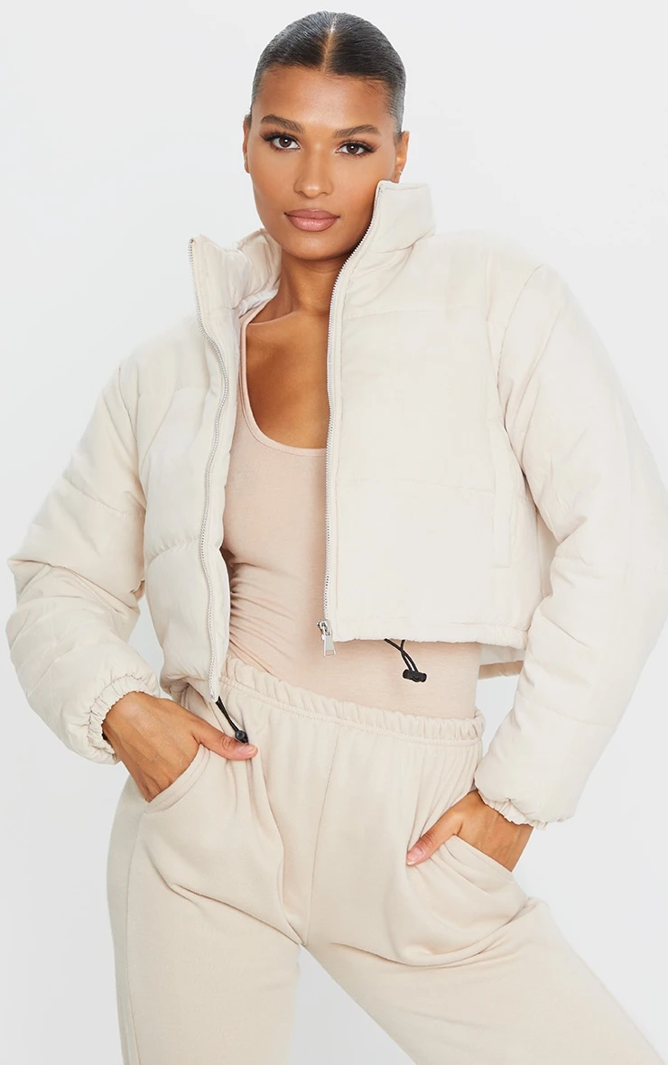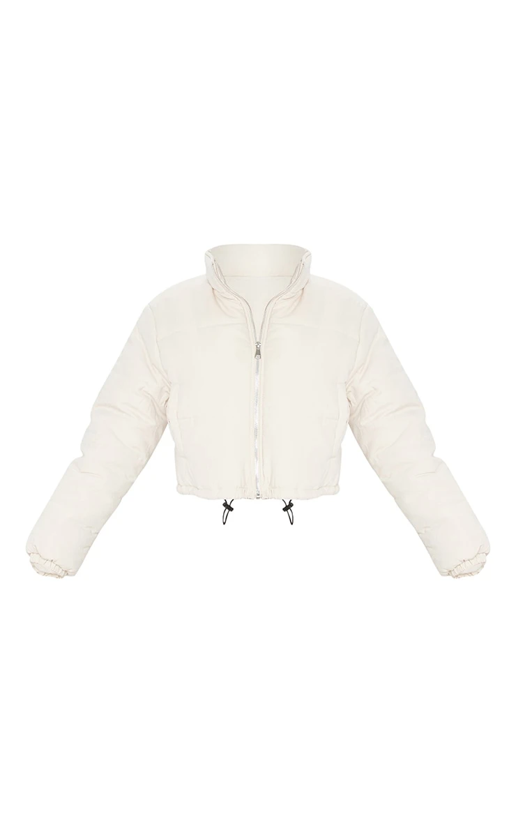 This neutral hue jacket is perfect to complete any look. Featuring a cream peach skin material with a super cropped length and a zip fastening. Style this with your existing wardrobe pieces.
