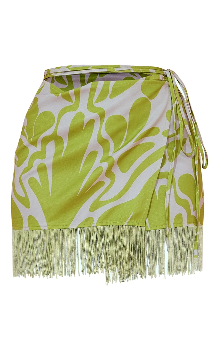 This mini skirt is sure to give your look a simple update. Featuring a green abstract print material with a wrap design, tassel hem and a flattering fit. Team this with a linen look crop top and tie-up heels to have all eyes on you.