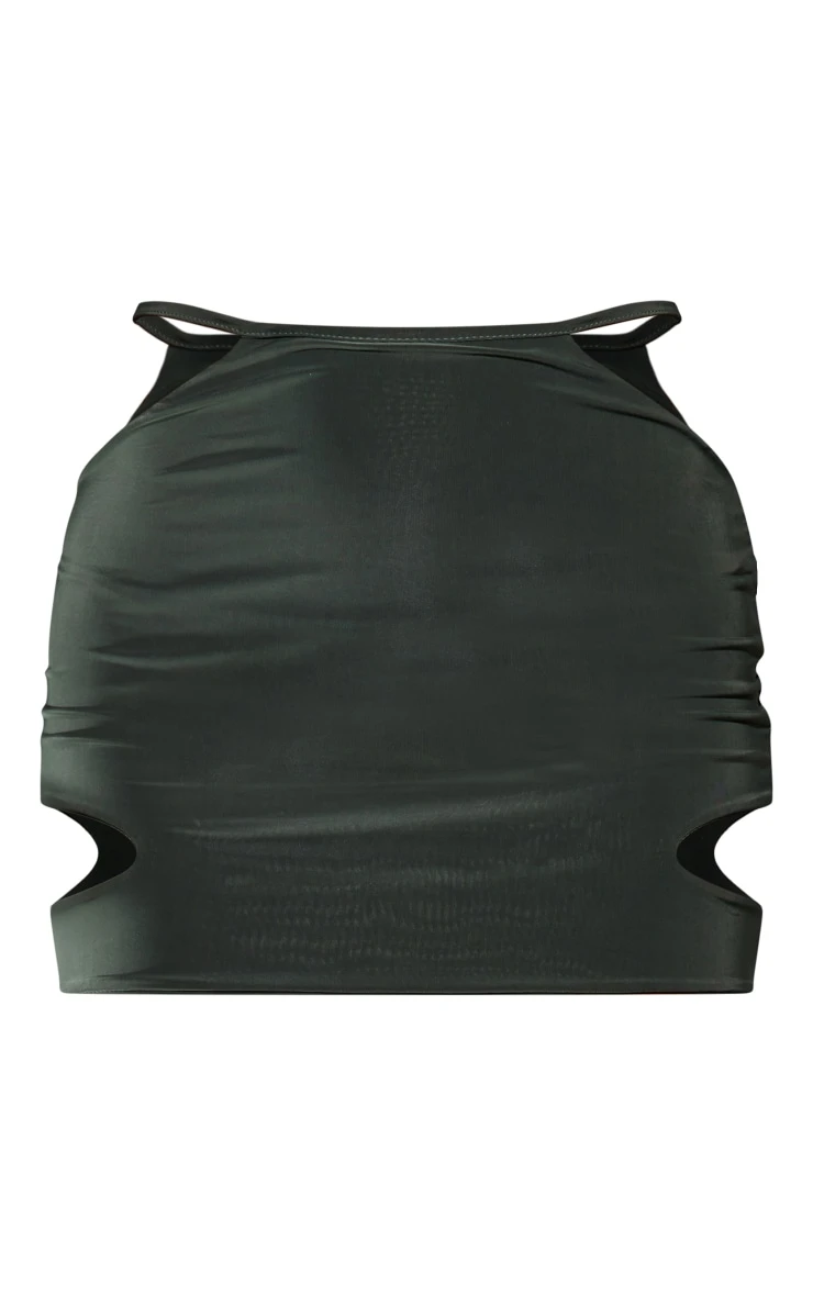 This skirt is all you need for your new season needs doll. Featuring a khaki slinky material with a cut out detailing, a strappy design and a mini length, we are in love. Wear with high heels and the matching top for a coordinated combo.