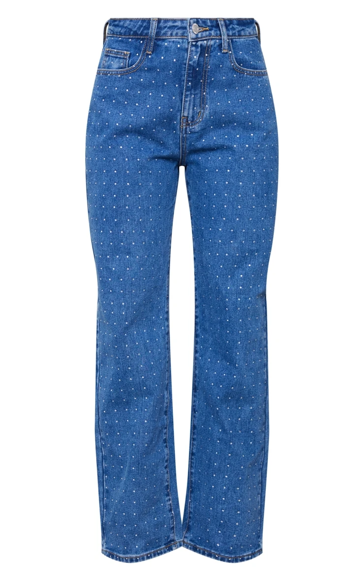 These jeans are everything your need to take your look from 0-100. Featuring a mid blue denim wash material with a scattered diamante design and a wide leg fit, we’re obsessed. Add the matching denim corset, high heels and a black shoulder bag for a stylish combo like no other.