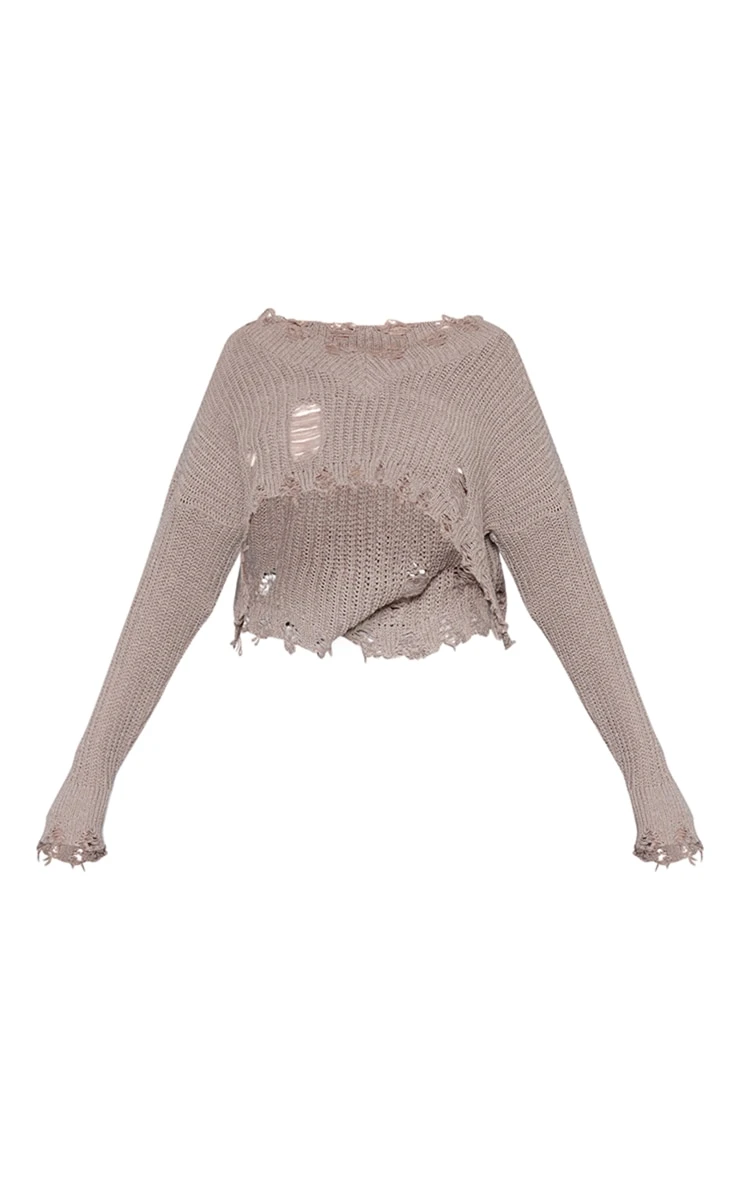 Add some knit feels into your look of the day with this jumper doll. Featuring a mocha extreme disressted knit material with a cropped front, we’re in love. Wear with your comfy bottoms, box-fresh kicks and accessories to complete the look.