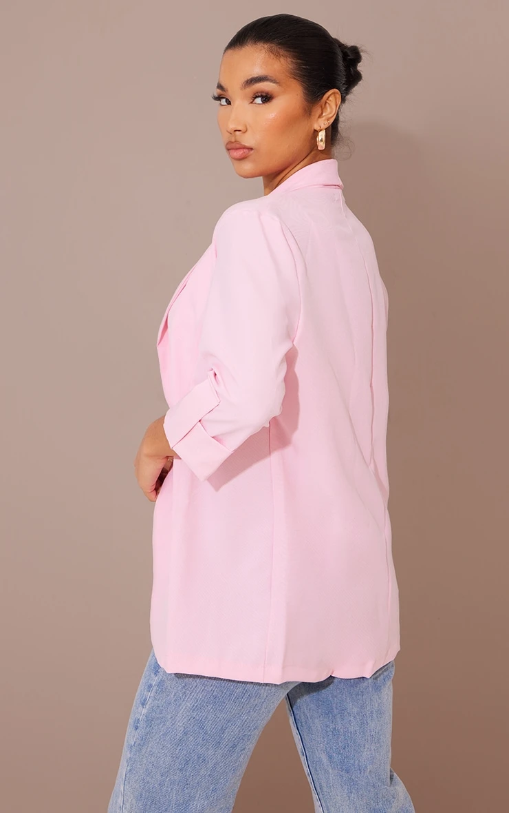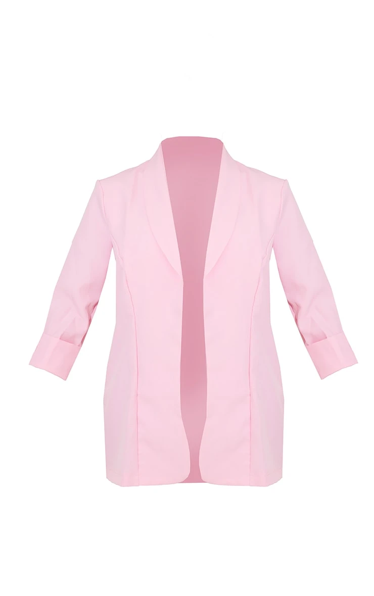 Add some fiercely feminine vibes to your look with this blazer. Featuring a pink woven material with turn-up sleeves and an open front design. Style this with a crop top, faux leather skirt and heeled mules to complete the look.