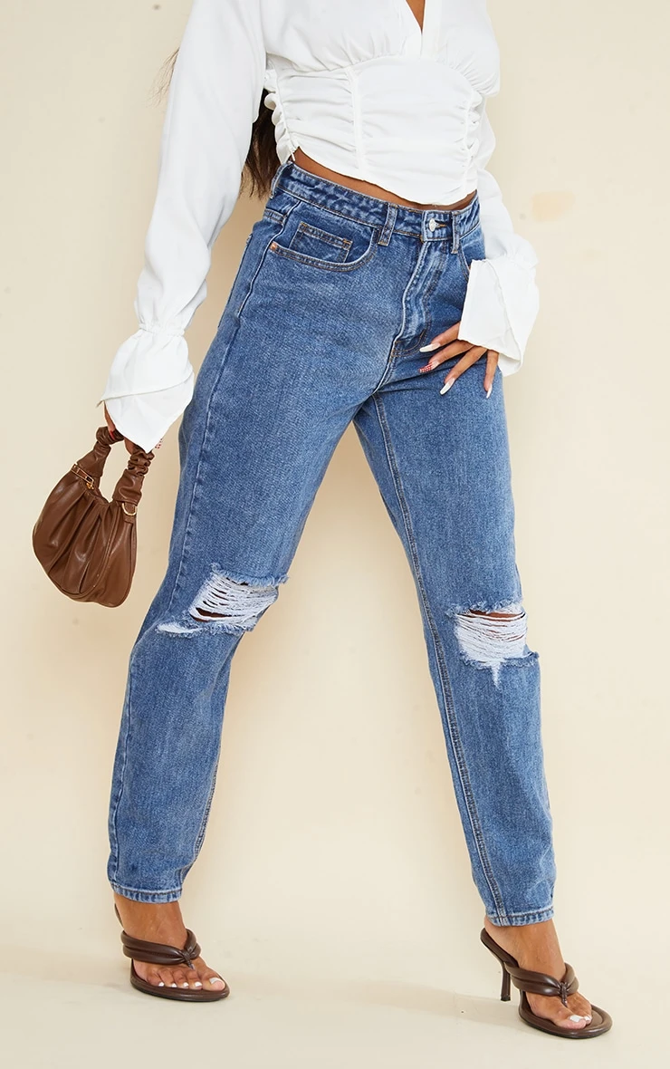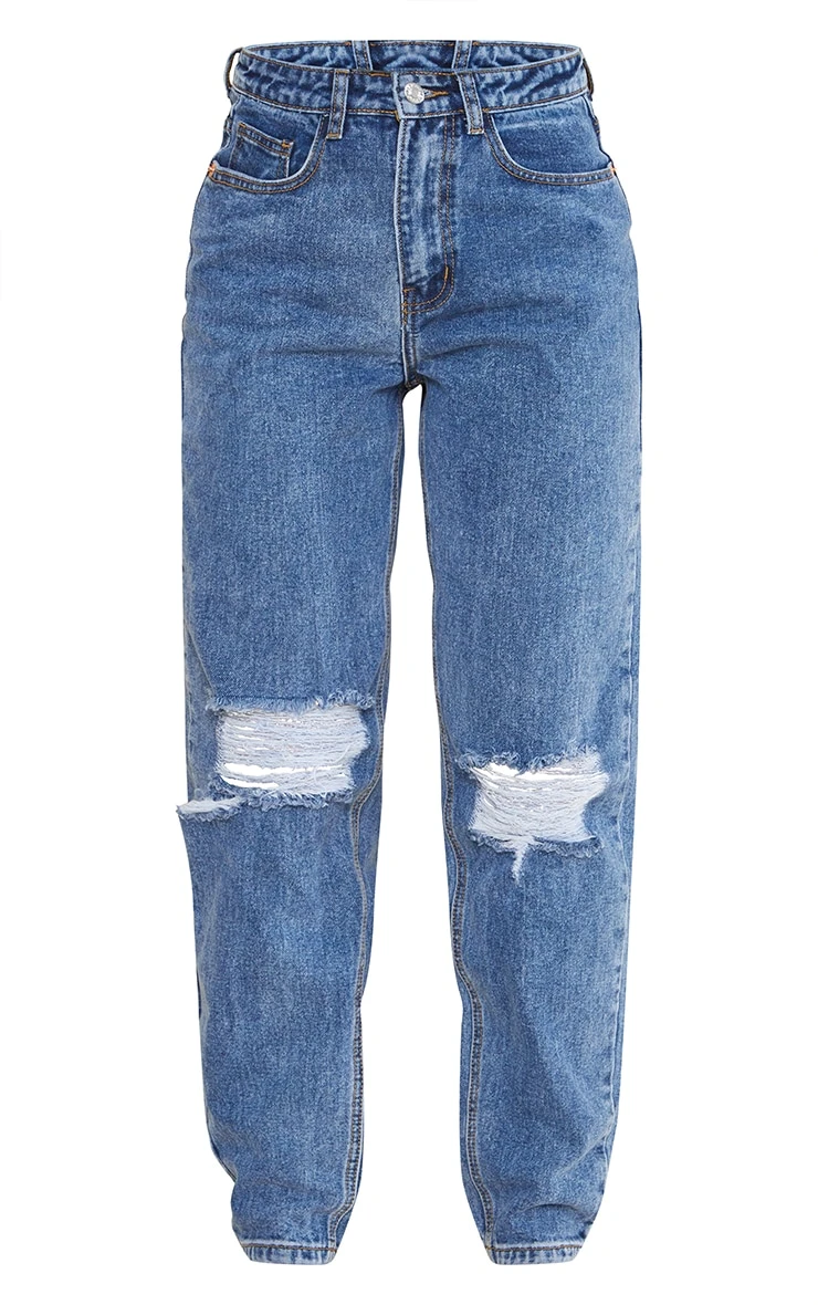 Ripped jeans are perfect for giving any outfit a killer edge and we are obsessing over this design. Featuring dark blue denim with a knee rip and a mom fit, team them with a light wash denim top and chunky boots.