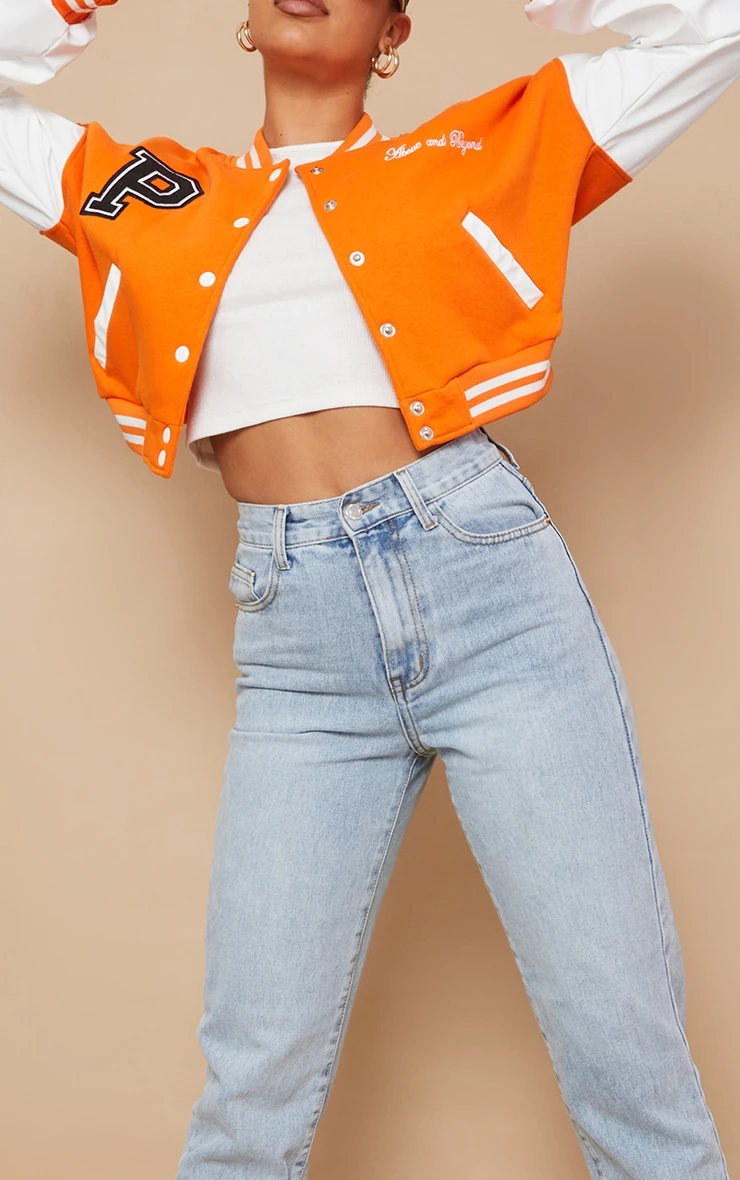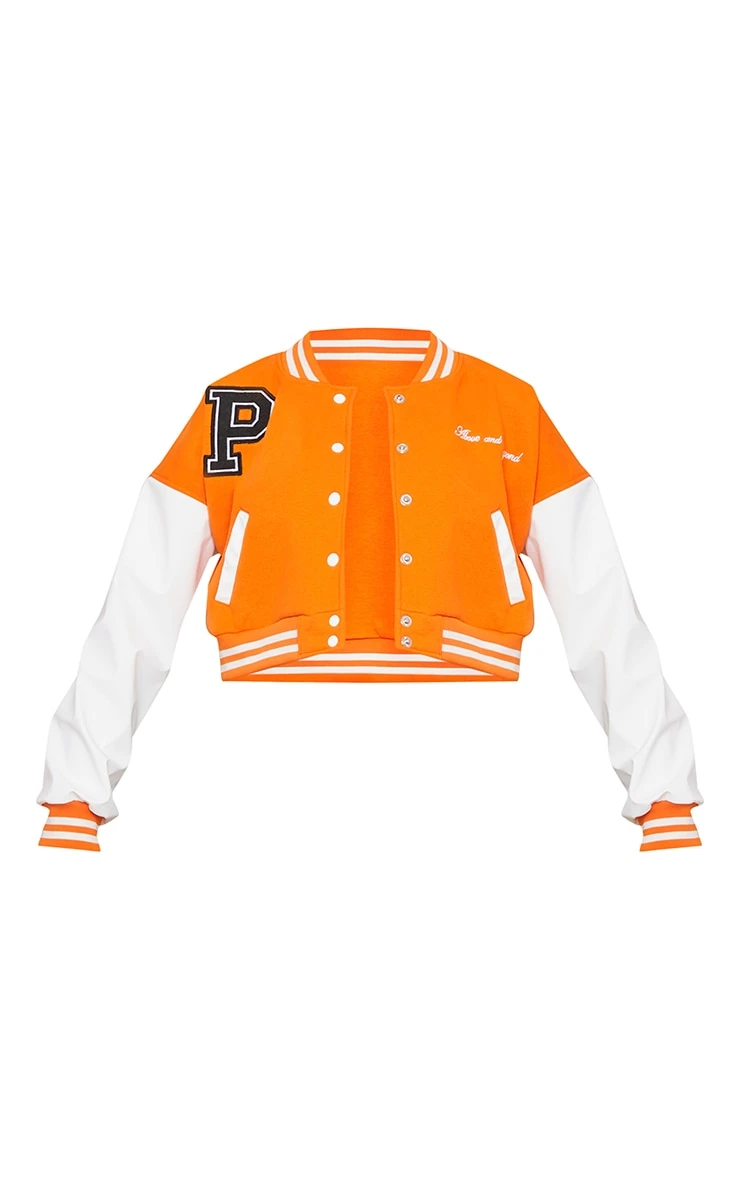 Nail new season trends with this unreal PrettyLittleThing orange varsity slogan contrast sleeve bomber jacket, we’re all about bold hues that are sure to get you noticed doll. Featuring an orange hue material with a varsity slogan and contrasting sleeves, what more could you want? Wear with a white tee, your go-to jeans and kicks for a fresh everyday look everyone will be obsessing over.