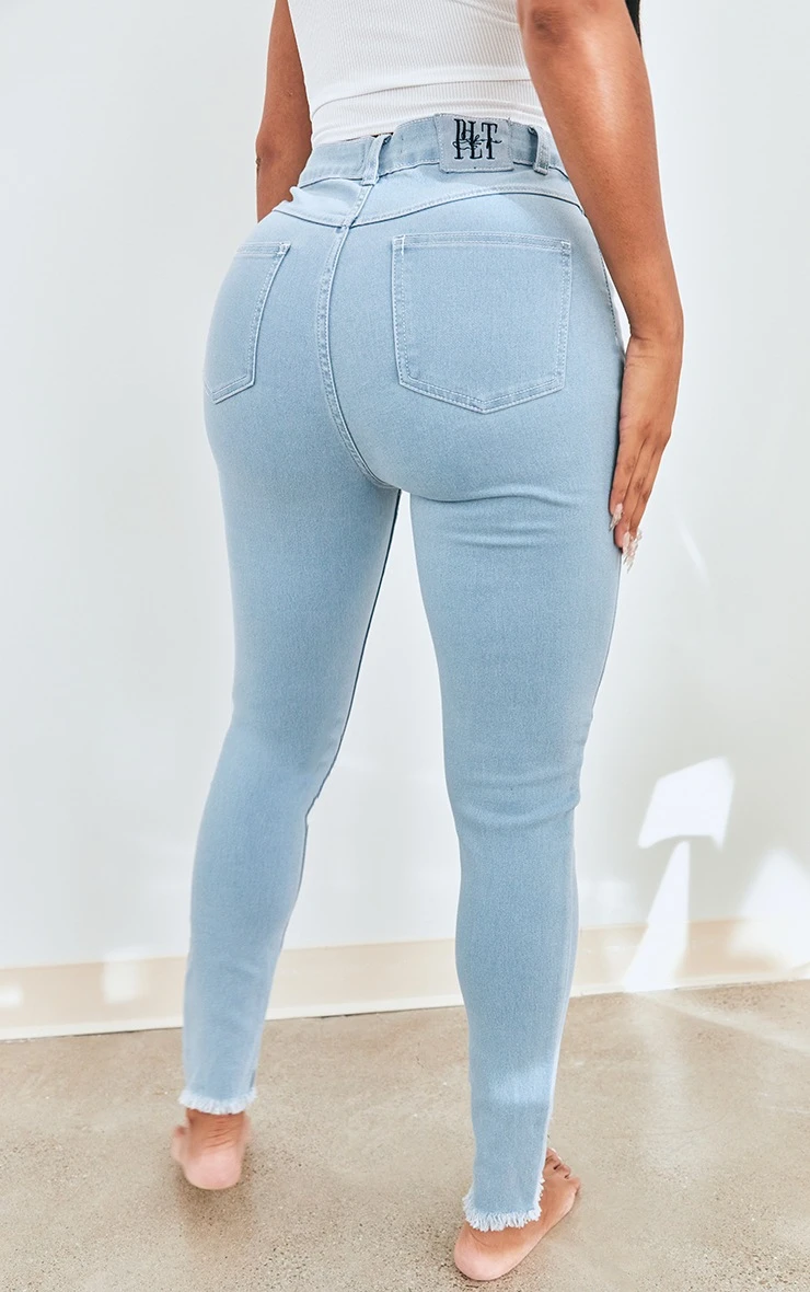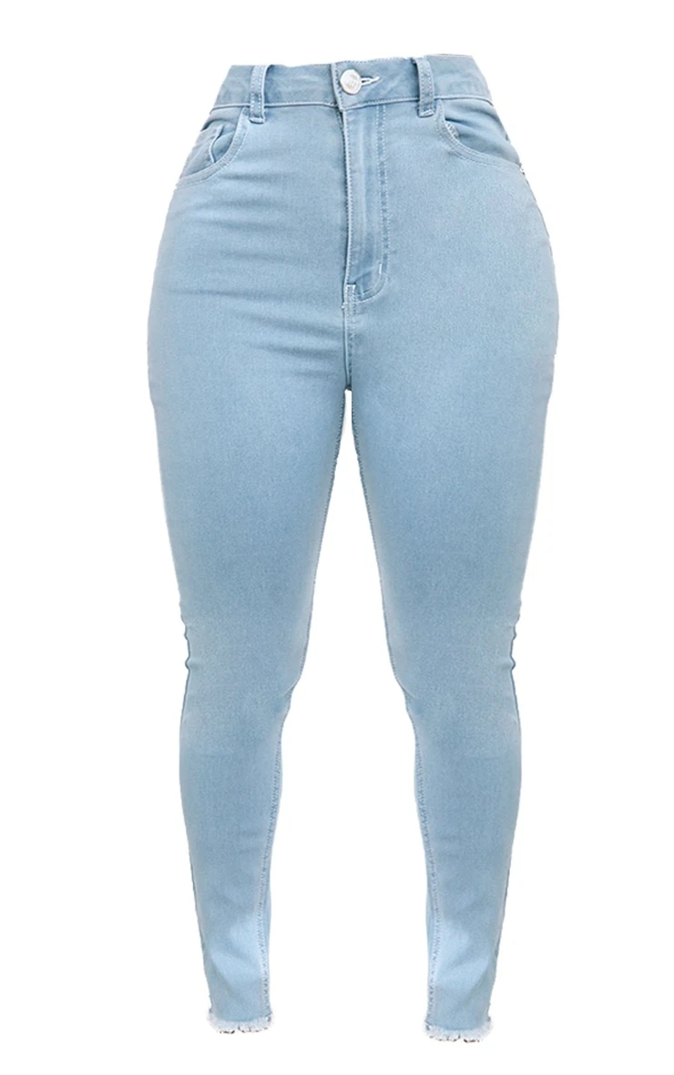 Make everyday styling simple with these jeans. Featuring a light blue wash material with a high waisted design, frayed hem detailing and a skinny fit. Pair this with your existing wardrobe pieces for a look that will earn serious style points.