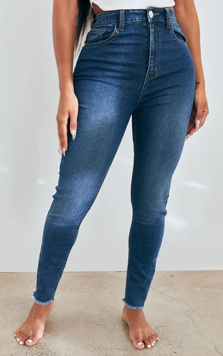 Show off your silhouette in these must-have have jeans. Featuring a mid-blue wash denim material with a high waistline, frayed hem and a skinny fit. Team these with a crop top and footwear to suit the occasion.