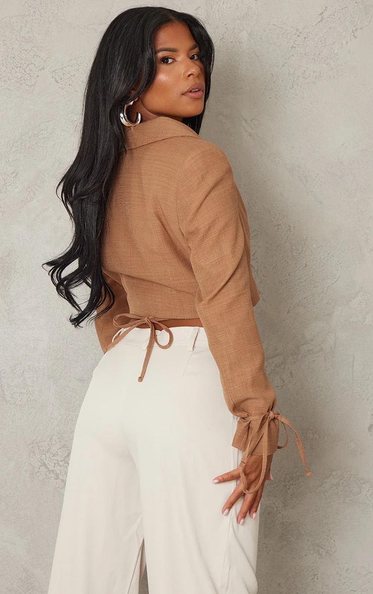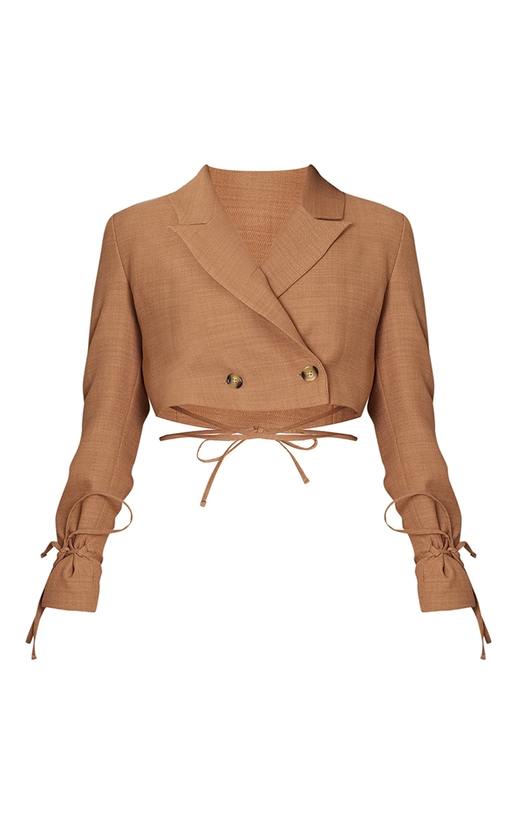 Add some chic vibes to your weekend look with this blazer. Featuring a rust hue textured material with tie detailing and a cropped length. Style with tailored bottoms, a cropped tee and heels for a look we just can’t get enough of.