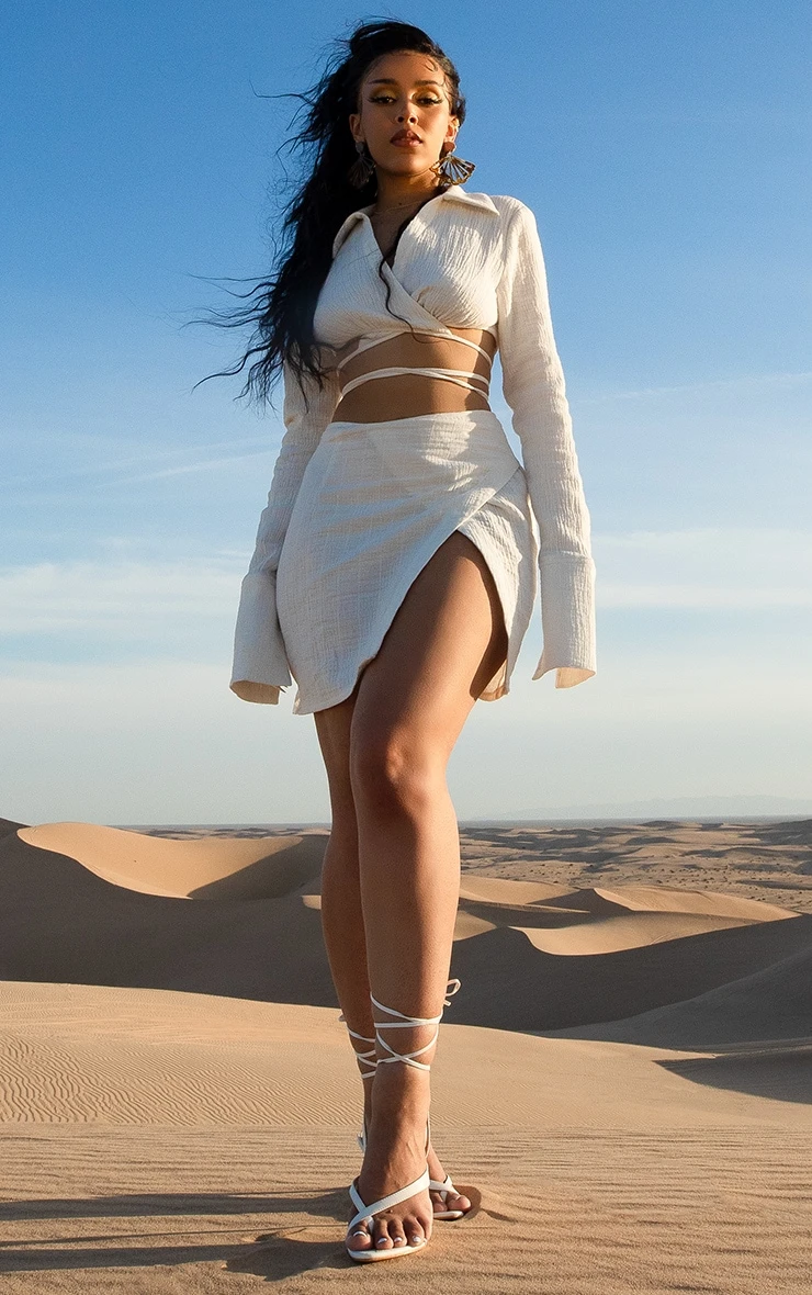 We are obsessing over this mini skirt for your new season wardrobe doll. Featuring a white waffle material with a tie wrap detail and high waist fit, what’s not to love? Style with lace-up heels, statement earrings, and a matching top for a seriously chic look.