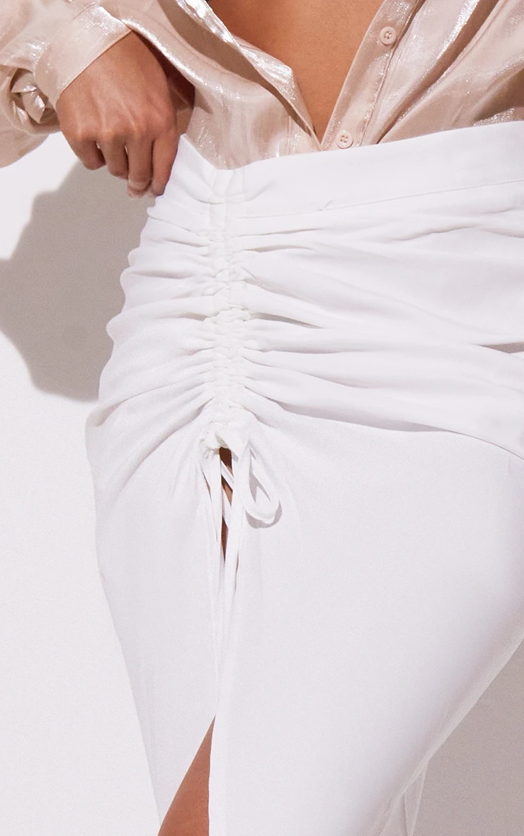 This midi skirt is perfect for dressing up or down. Featuring a white woven material with a ruched design, what’s not to love? Wear this skirt with a slogan tee and knee-high boots for a look that we are loving.